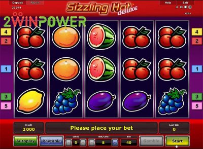 - Sizzling hot. Dobrze znany automat od dostawcy Novomatic, który urzeka prostotą i dość wysokimi wypłatami. Gracz ma pięć bębnów, pięć linii wygrywających i jasne owoce na boisku: cytrynę, arbuza, wiśnie, śliwki.