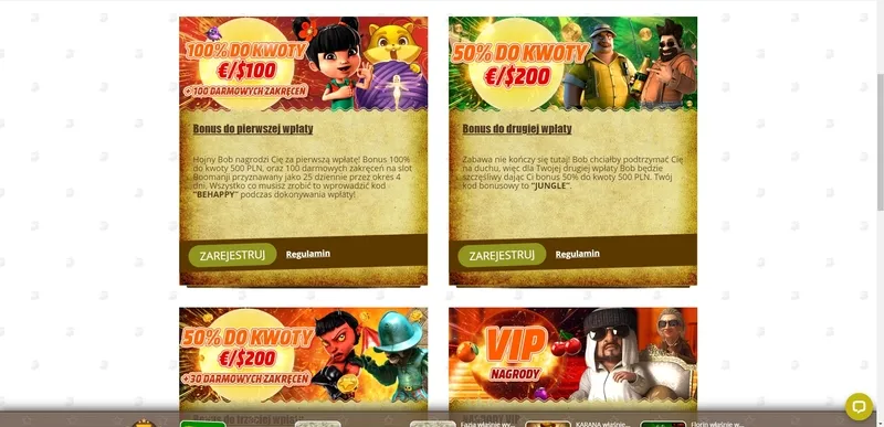 W centralnej części serwisu znajdują się wprowadzające elementy sali gier z najpopularniejszymi rozrywkami. Jeśli zejdziesz na dół strony głównej jeszcze niżej, to w stopce znajdziesz dodatkowe informacje o działalności kasyna online: zasady gry, opis programu partnerskiego, blog tematyczny o grach hazardowych, funkcje polityki prywatności i inne informacje o działaniach Bob Casino w Internecie. Ze względu na obsługę różnych opcji językowych przy wyświetlaniu stron serwisu, odwiedzający mogą pobierać strony w języku polskim, angielskim, portugalskim, hiszpańskim, chińskim, francuskim i kilku innych popularnych językach.